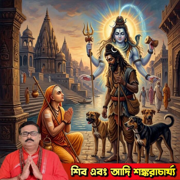 কাশীতে বিশ্বনাথ মন্দিরদর্শন করতে যাওয়ার সময় স্বয়ং শিব এক চন্ডাল রূপে তাকে দর্শন দিয়ে ছিলেন। তখন তর্ক শাস্ত্রে তার মতো জ্ঞানী দেশে আর কেউ ছিলোনা। মনে করা হয় নিজের অসীম জ্ঞানের জন্য শঙ্করাচার্য্য যখন সামান্য অহং বোধের শিকার হন তখন একদিন পথে এক চণ্ডাল তার সামনে আসেন।তার সঙ্গে ছিলো কয়েকটি ভীষণ দর্শন কুকুর।আদি গুরু তাকে পথ থেকে সরে দাঁড়াতে বলেন। স্বাভাবিক ভাবেই চণ্ডালের আগমন তাকে বিব্রত এবং বিরক্ত করেছিলো। সেই সময় সেই ভয়ংকর চেহারার চণ্ডাল তখন শঙ্করাচার্য্য কে বলেন যদি অদ্বৈত বাদ সত্য হয়। সব জীবেই পরম ব্রহ্ম বাস করেন। তবে চণ্ডাল আর ব্রাহ্মনে ভেদ থাকা উচিৎ নয়। মুহূর্তে আদি গুরু তার ভুল বুঝতে পারেন। সেই চণ্ডালের সামনে মাথা নত করেন। তখন শিব নিজ রূপে তাঁকে দেখা দেন।শংকরাচার্য্য ধন্য হন বিশ্বনাথের দর্শন পেয়ে।